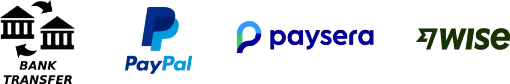 - Paiement via PayPal, Wise, Paysera ou virement bancaire dès réception du paiement du client.